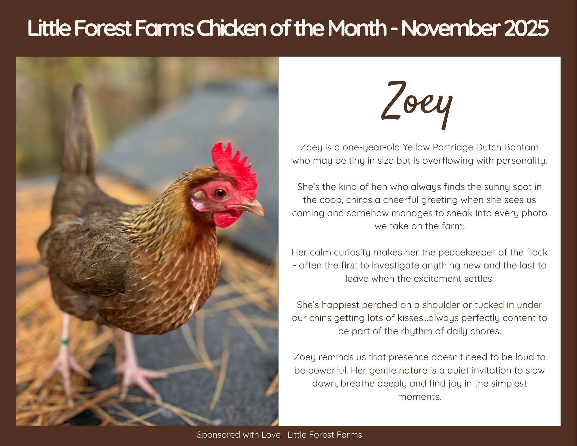 When you sponsor this month’s Chicken of the Month, your support helps feed and care for our entire flock - the hens, roosters, and all their feathered friends who make Little Forest Farms so special.
